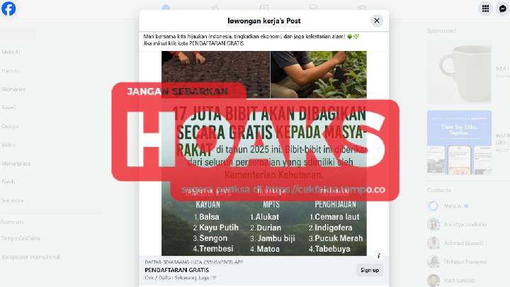 INFORMASI soal bantuan 17 juta bibit gratis dari Kementerian Kehutanan dibagikan akun Facebook [arsip], 23 September 2025.