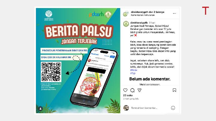“Belakangan beredar info soal 17 juta bibit gratis untuk masyarakat, ini hoax, ya,” dikutip dari akun PPTH @direktoratppth.