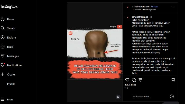 UNGGAHAN beredar di Instagram [arsip] pada 6 November 2025 membagikan tips kesehatan tentang cara meredakan sakit kepala dengan menempelkan es di belakang leher atau tengkuk.