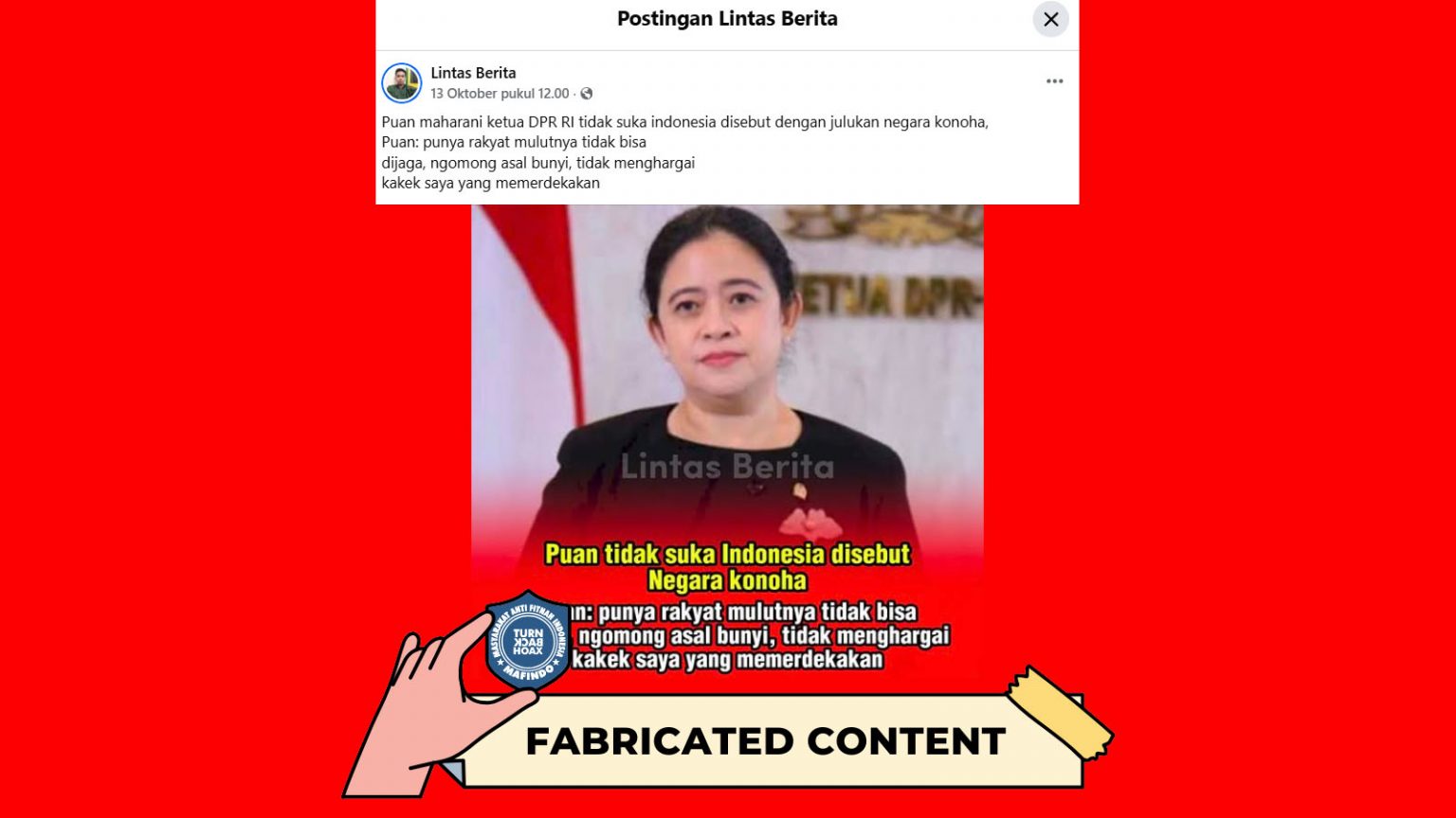 Unggahan berisi klaim “Puan Maharani tidak suka Indonesia disebut Negara Konoha” adalah konten palsu (fabricated content).