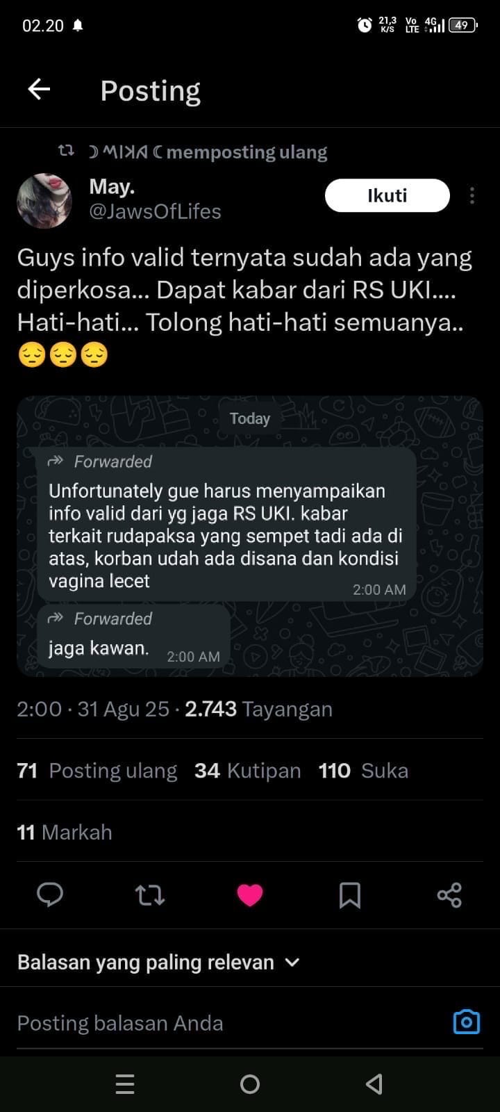 SEBUAH tangkapan layar dengan klaim korban pemerkosaan selama aksi unjuk rasa di Jakarta beredar di WhatsApp [arsip] dan X pada 31 Agustus 2025. Korban disebut dirawat di Rumah Sakit Umum Universitas Kristen Indonesia (RSU UKI).