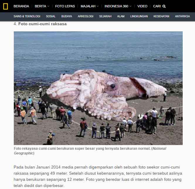 Sebuah situs dengan alamat posmetro.pw memposting hoax adanya cumi-cumi raksasa sepanjang 49 meter terdampar di pantai Meulaboh, Aceh dan warga beserta aparat dan TNI bekerjasama untuk mengevakuasi hewan tersebut kembali ke lautan dalam.