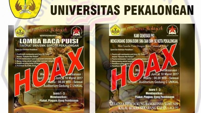 Dengan hormat, sehubungan dengan beredarnya berita di media sosial maupun media cetak berkaitan erat dengan Institusi kami Universitas Pekalongan (UNIKAL) yang berisi tentang “Lomba Baca Puisi Karya Wiji Thukul, yang diseleggarakan oleh organisasi yang mengatasnamakan Gerakan PKI di UNIKAL” adalah SANGAT TIDAK BENAR itu jelas sekali berita HOAX, karena UNIKAL tidak menyelenggarakan lomba baca puisi sebagaimana leaflet tersebut. Itu perbuatan orang yang tidak bertanggung jawab yang ingin mencoreng nama Universitas Pekalongan. Sampai dengan saat ini masih dalam penyelidikan pihak yang berwajib. Demikian klarifikasi atas fitnah terhadap Institusi Unikal.