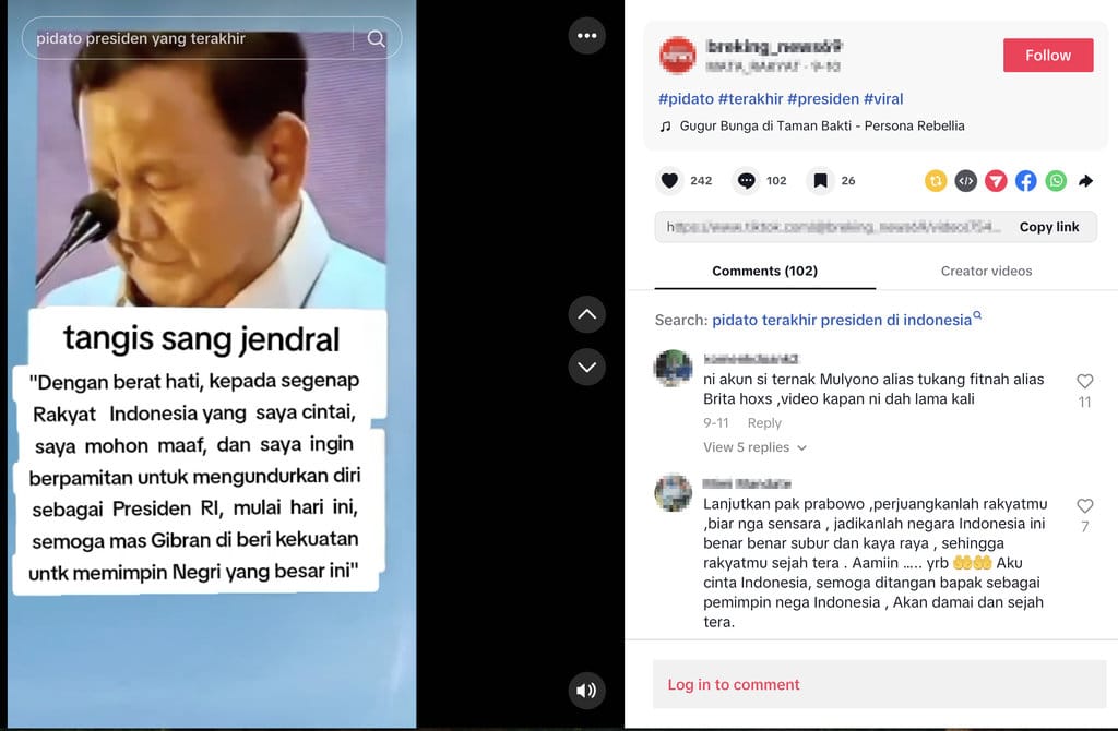 Akun TikTok @breaking_news69 (arsip) mengunggah potongan video tersebut dengan narasi pengunduran diri Prabowo sebagai Presiden Indonesia. Unggahan yang pertama tayang 10 September 2025 lalu itu menunjukkan potongan video Prabowo menangis dan ditambahkan narasi teks.