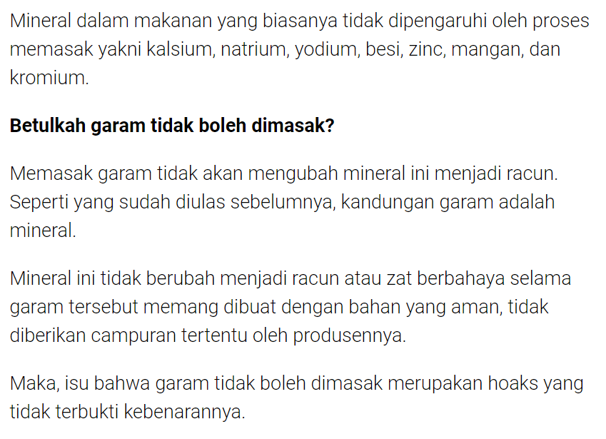 Isu garam bila dimasak menjadi racun adalah hoaks. Dilansir dari hallosehat.com dan kompas.com, garam adalah kumpulan dari zat mineral. Memasak tidak mengurangi kadar mineral dalam makanan dalam jumlah yang besar. Kalaupun berkurang, jumlahnya pun tidak terlalu banyak. Mineral dalam makanan yang biasanya tidak dipengaruhi oleh proses memasak yakni kalsium, natrium, yodium, besi, zinc, mangan, dan kromium. Meski begitu, tidak disarankan untuk terlalu banyak mengkonsumsi garam karena dapat meningkatkan risiko tekanan darah tinggi (hipertensi) dan penyakit jantung.