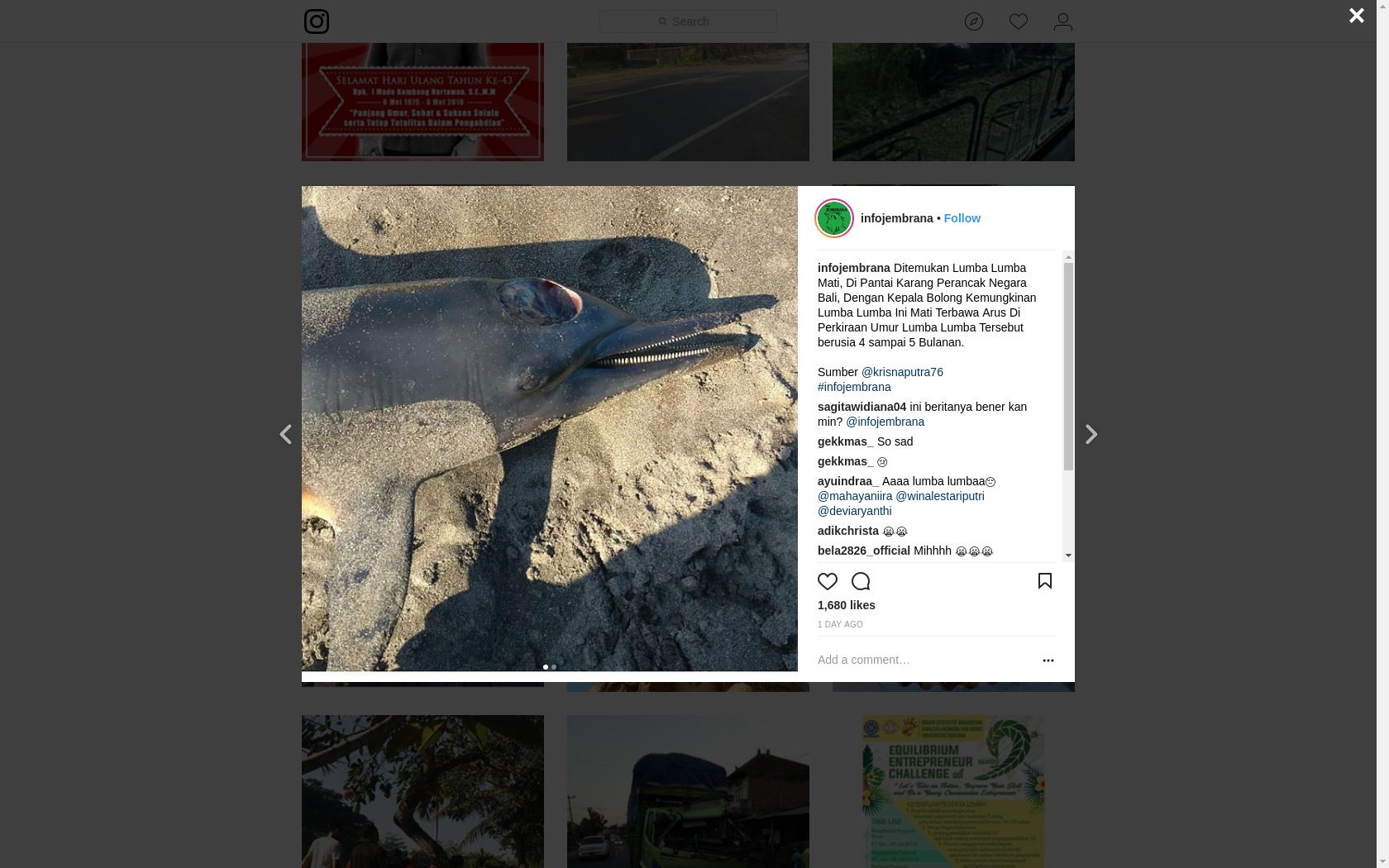 Dalam postingan IG infojembrana diberi narasi "Ditemukan Lumba-lumba Mati di Pantai Karang Perancak Negara Balli, Dengan Kepala Bolong Kemungkinan Lumba-Lumba Ini Mati Terbawa Arus Diperkiraan Umur Lumba-Lumba Tersebut berusia 4 sampai 5 Bulanan”.