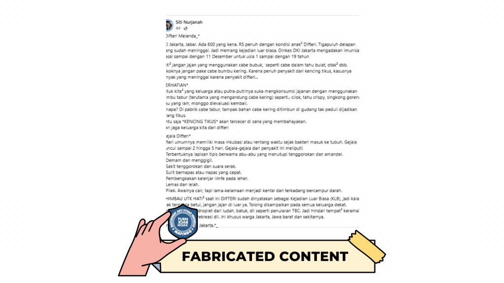 Unggahan dengan narasi “Kejadian luar biasa Difteri di Jakarta” merupakan konten palsu (fabricated content).