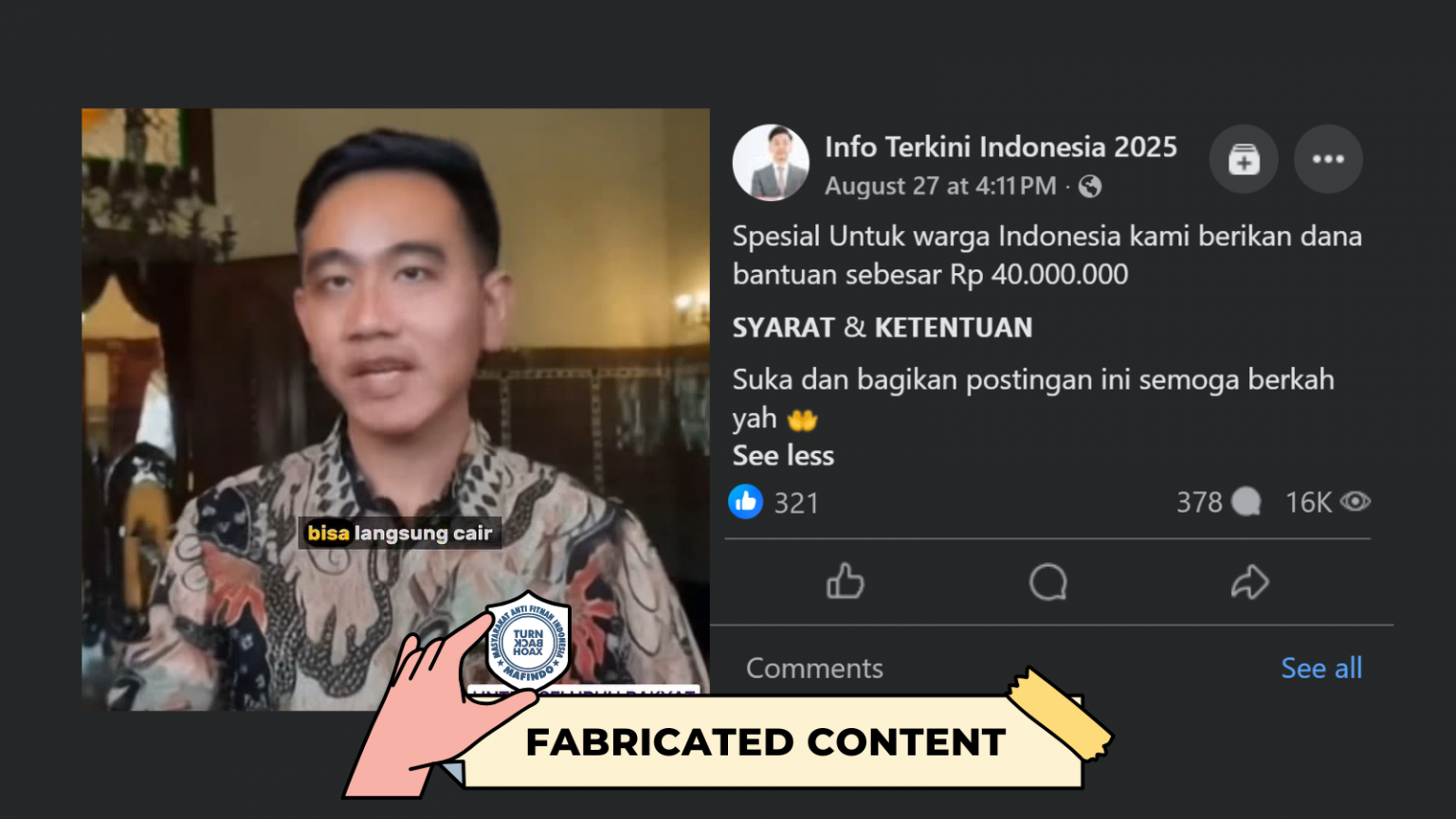 Unggahan video berisi klaim “Wakil Presiden Gibran bagi-bagi bantuan dana puluhan juta” merupakan konten palsu (fabricated content).