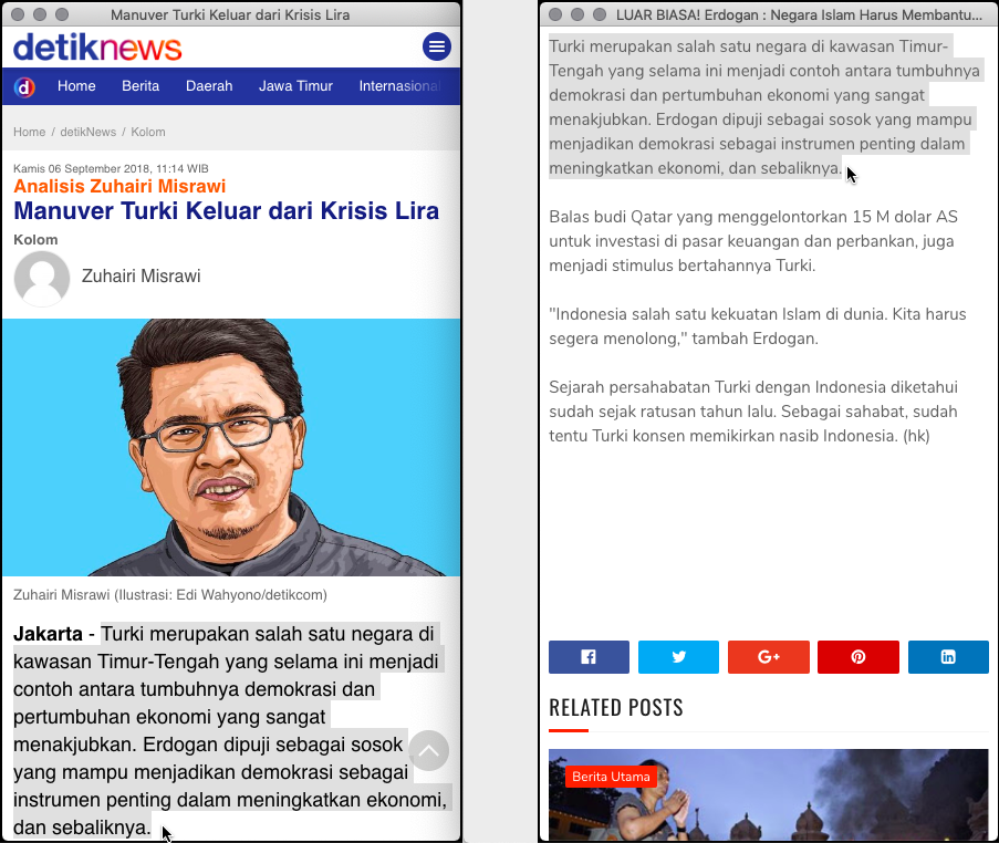 Meski baru diterjang krisis ekonomi akibat secara tegas melawan keinginan Presiden AS Donald Trump, Presiden Erdogan sudah membuat gerakan luar biasa. Dengan menyerukan agar negara-negara Islam kaya, menolong Indonesia melepaskan diri dari jeratan hutang…”, selengkapnya di (2) bagian REFERENSI.