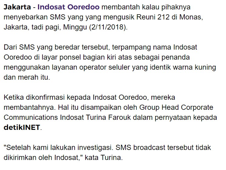 Pihak Indosat Ooredoo memberikan klarifikasi terkait pesan berantai SMS kepada penggunanya saat acara Reuni Alumni 212. Group Head Corporate Communications Indosat Turina Farouk menyatakan bahwa pesan SMS berantai itu tidak dikirim Indosat kepada para penggunanya. “Setelah kami lakukan investigasi. SMS broadcast tersebut tidak dikirimkan oleh Indosat,” ujarnya.