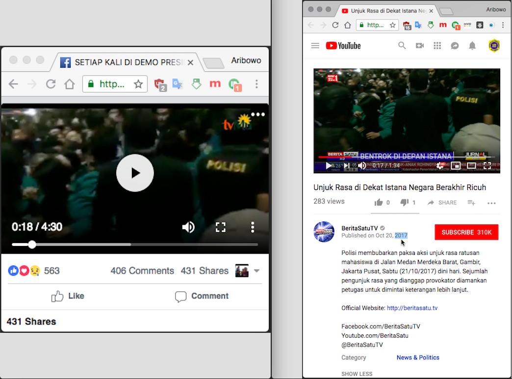 Akun atas nama Farid Fathur Fakhrudin mengunggah beberapa foto mahasiswa yang dianiaya oleh aparat kepolisian. Melalui narasinya, foto-foto itu seolah-olah berasal dari peristiwa yang baru saja terjadi. Namun, berdasarkan penelusuran, foto-foto itu berasal dari berbagai media pada tahun 2011, 2012, 2014, dan 2016. Dengan demikian, foto-foto itu bukan dari peristiwa yang baru saja terjadi. Adapun, keempat foto itu pun dipublikasikan di media massa sehingga klaim bahwa media massa tidak meliputnya merupakan klaim yang tidak benar.