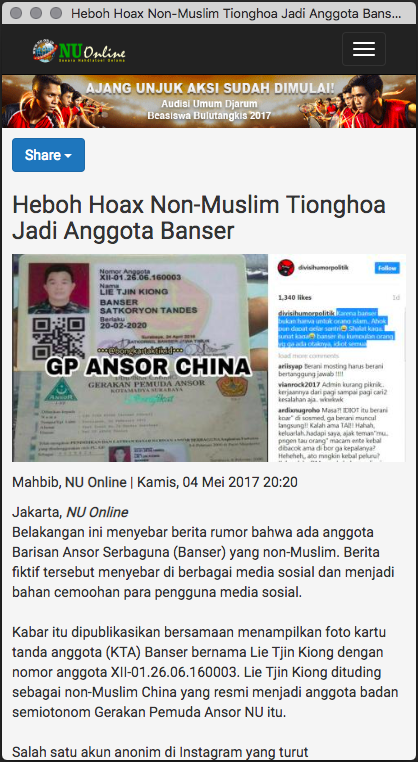 Disinformasi dengan bahan daur ulang yang sudah diklarifikasi di 2017: “Kepala Satkorwil Banser Jatim Gus Abid Umar menegaskan, Lie Tjin Kiong ini merupakan salah seorang pengurus Masjid Cheng Ho Surabaya yang telah mengikuti Diklatsar Banser.”, selengkapnya di bagian PENJELASAN dan REFERENSI.