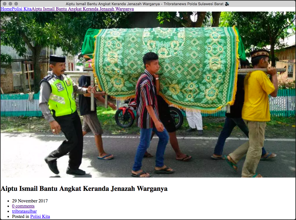 Tribrata News Polda Sulawesi Barat @ 29 November 2017: “Aiptu Ismail Bantu Angkat Keranda Jenazah Warganya”, salah satu situs yang fotonya digunakan oleh post sumber. Konteks berita tidak ada hubungannya dengan narasi yang digunakan oleh post sumber, selengkapnya di bagian PENJELASAN dan REFERENSI.