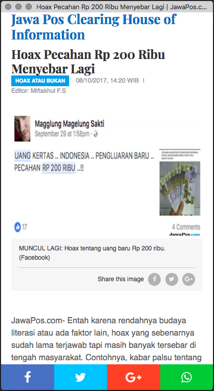Sudah pernah beredar dan diklarifikasi di 2016: "Kepala Departemen Komunikasi Bank Indonesia Tirta Segara menegaskan, sampai saat ini BI hanya mengeluarkan dan mengatur pecahan rupiah paling besar yaitu Rp 100 ribu. "Terkait informasi yang beredar di medsos mengenai uang pecahan Rp 200 ribu, Bank Indonesia menyatakan bahwa informasi tersebut tidak benar," kataTirta dalam keterangannya, Kamis (18/2/2016)."