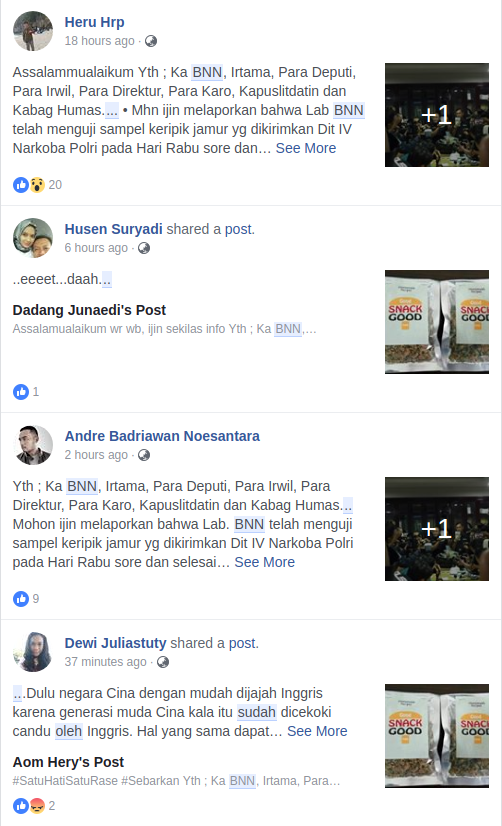 (GFD-2018-416) [DISINFORMASI] Pesan Berantai Keripik Jamur “Snack Good” yang Mengandung Narkoba Golongan 1