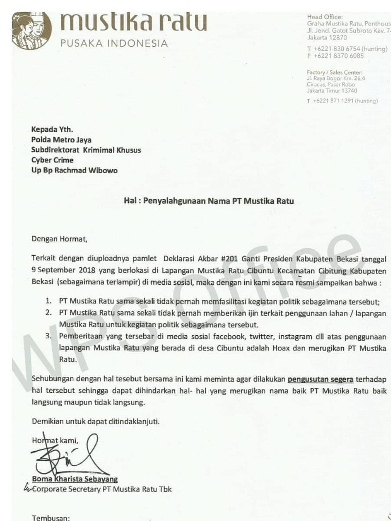 Pemberitaan yang tersebar di media sosial Facebook, Twitter, Instagram dan lain-lain atas Penggunaan lapangan Mustika Ratu yang berada di desa Cibuntu adalah Hoax dan merugikan PT Mustika Ratu.