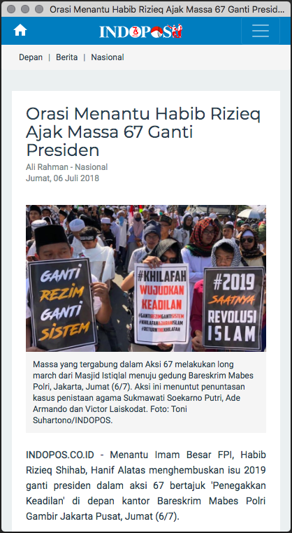 Foto tersebut dimuat di Indopos: “Massa yang tergabung dalam Aksi 67 melakukan long march dari Masjid Istiqlal menuju gedung Bareskrim Mabes Polri, Jakarta, Jumat (6/7).”, selengkapnya di bagian PENJELASAN dan REFERENSI.