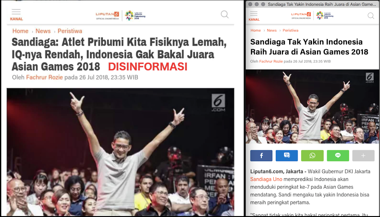 (GFD-2018-373) [DISINFORMASI] Gambar hasil suntingan di berita "Sandiaga Tak Yakin Indonesia Raih Juara di Asian Games 2018"