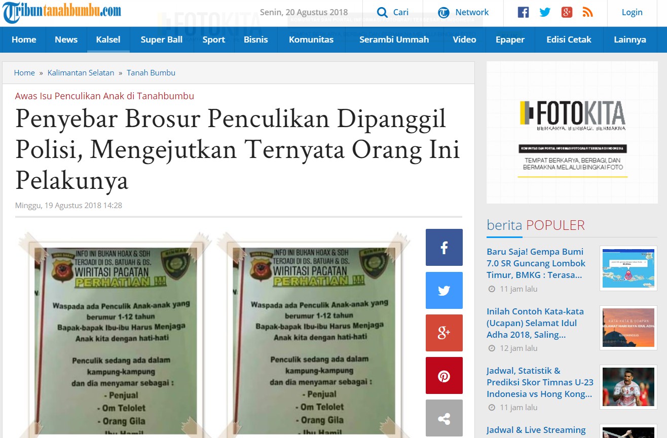 - http://banjarmasin.tribunnews.com/2018/08/19/penyebar-brosur-penculikan-dipanggil-polisi-mengejutkan-ternyata-orang-ini-pelakunya