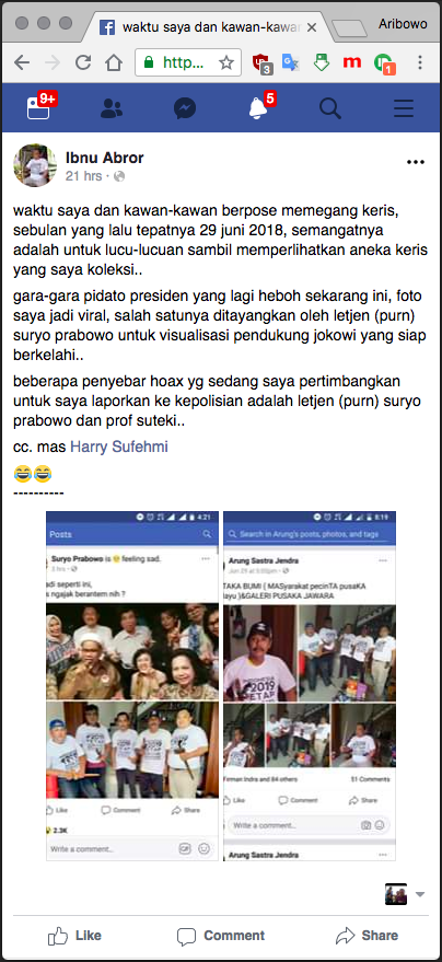 (1) "koq jadi seperti ini, serius ngajak berantem nih ?" | (2) "Reaksi arus bawah atas pidato kontroversi presiden...sangat berbahaya karena survei pendukung Jokowi kebanyakan berpendidikan rendah" | (3) "Bila Anda melihat foto ini dengan seksama, apa yang ada di benak Anda? Keris di hadapan dan ditangan itu senjata pamungkas Priyayi Jawa untuk menyatakan bahwa dirinya sudah siap berperang MELAWAN dan MELIBAS musuh. Saya prihatin, ternyata ucapan seorang pimpinan secara tidak sadar telah menggerakkan pemujanya untuk bertindak di luar kewajaran. (Terdeteksi ini foto 29 Juni 2018, saya tidak menyebutkan pimpinannya siapa, tetapi pasti ada pimpinan dibalik foto ini)."