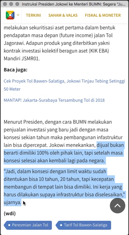 Konteksnya adalah konsesinya, bukan kepemilikan: "dijual bukan berarti dimiliki 100% oleh pihak lain, tapi setelah masa konsesi selesai akan kembali lagi pada negara." Selengkapnya di bagian PENJELASAN dan REFERENSI.