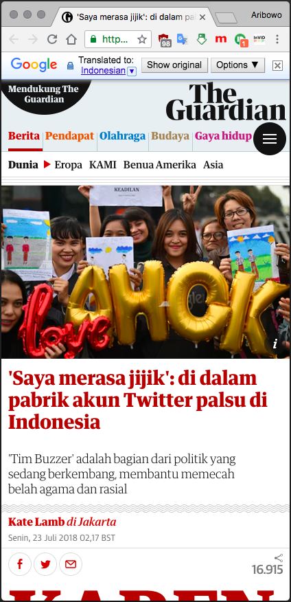 (GFD-2018-286) [BENAR] The Guardian: "'Saya merasa jijik': di dalam pabrik akun Twitter palsu di Indonesia"