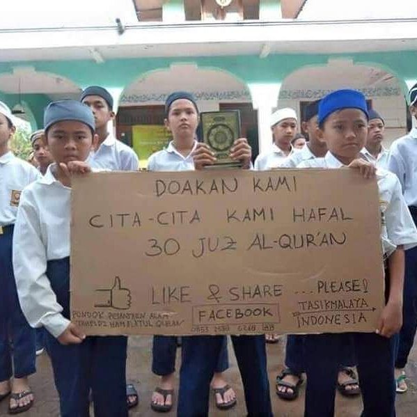 Isi tulisan sesungguhnya dalam spanduk tersebut adalah ‘Doakan Kami, Cita-Cita Kami Hafal 30 Juz Alqur’an’.