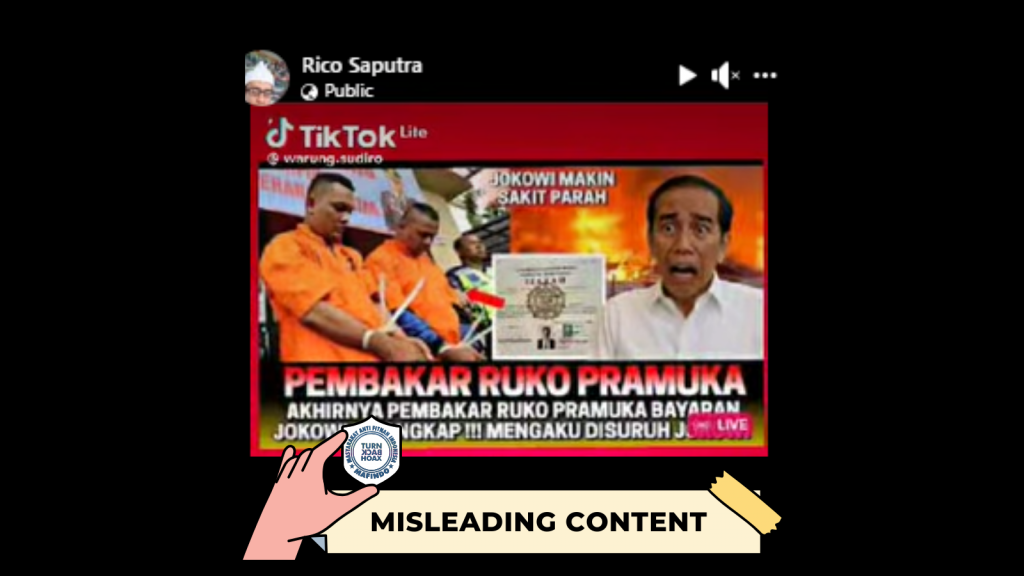 Unggahan dengan narasi “pembakar ruko pramuka bayaran Jokowi ditangkap” merupakan konten dengan konten yang menyesatkan (misleading content).