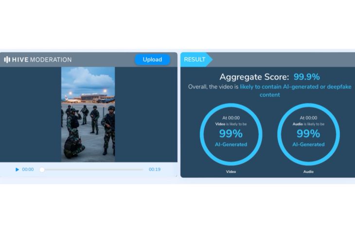 Hasil pemeriksaan yang dilakukan ANTARA menggunakan AI Detector Hive Moderation menunjukkan bahwa video tersebut 99,9 persen merupakan hasil buatan kecerdasan buatan (AI).