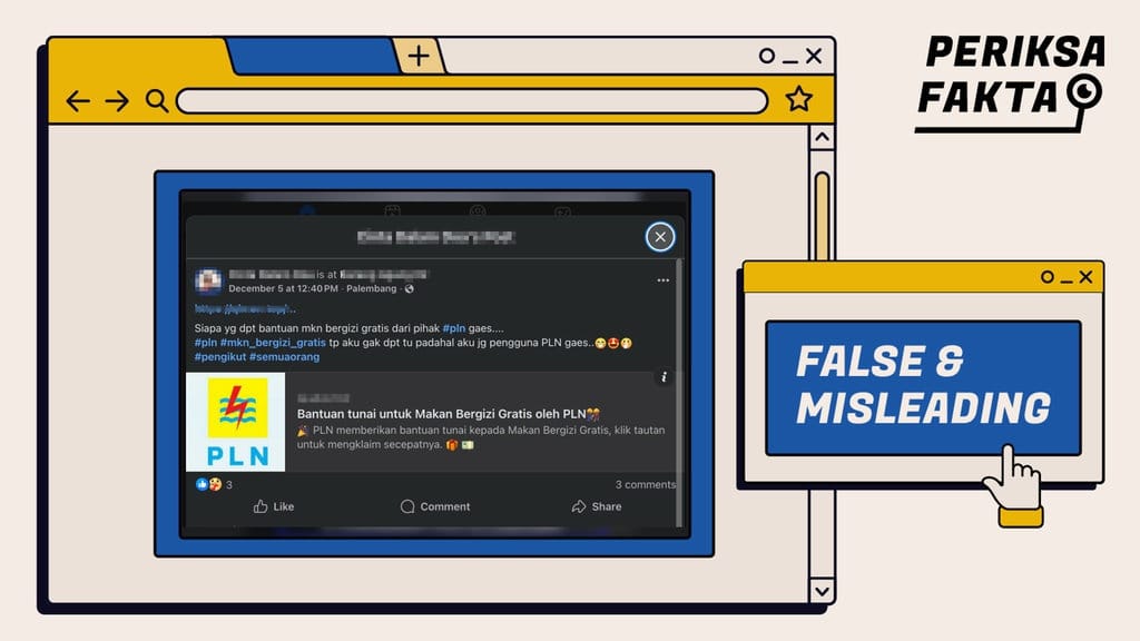 Berdasarkan penelusuran fakta, ditemukan bahwa klaim PLN memberikan bantuan tunai MBG sebesar Rp1.500.000 kepada masyarakat adalah salah dan menyesatkan (false and misleading).