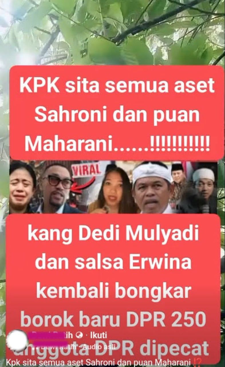 Narasi ini disebarkan salah satunya oleh akun Facebook “Dewi Ratih” (arsip) pada Jumat (12/9/025). Unggahan dalam bentuk video, menampilkan foto wajah Sahroni dan Puan Maharani dengan narasi keterangan teks yang menyatakan KPK menyita seluruh aset milik mereka berdua.