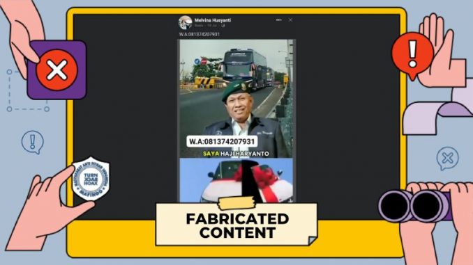 Unggahan video berisi klaim âKopral Kepala (Purn) H. Haryanto atau pemilik PO Haryanto bagi-bagi uangâ merupakan konten palsu (fabricated content).
