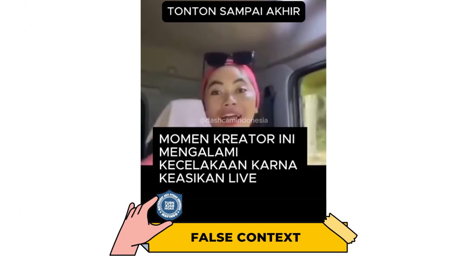 Unggahan berisi klaim “konten kreator FB Pro mengalami kecelakaan karena keasikan siaran langsung” adalah konteks yang salah (false context).