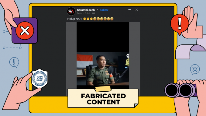 Akun Facebook “Serambi Aceh” pada Minggu (6/7/2025) membagikan video [arsip], isinya memperlihatkan seseorang berseragam TNI sedang berbicara dengan narasi sebagai berikut: