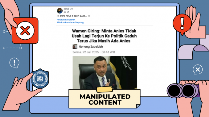 Pembuat konten yang disebarkan oleh akun Facebook “ICE PETIR” memanipulasi judul pemberitaan tersebut menjadi “Wamen Giring: Minta Anies Tidak Usah Lagi Terjun Ke Politik Gaduh Terus Jika Masih Ada Anies”.