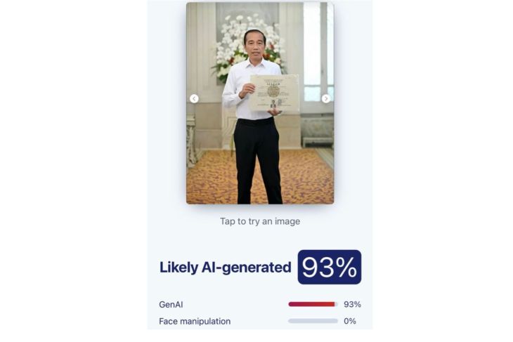 Selain itu, hasil pemeriksaan menggunakan AI detector menunjukkan bahwa foto tersebut memiliki tingkat kemiripan 93 persen sebagai hasil buatan AI atau kecerdasan buatan.