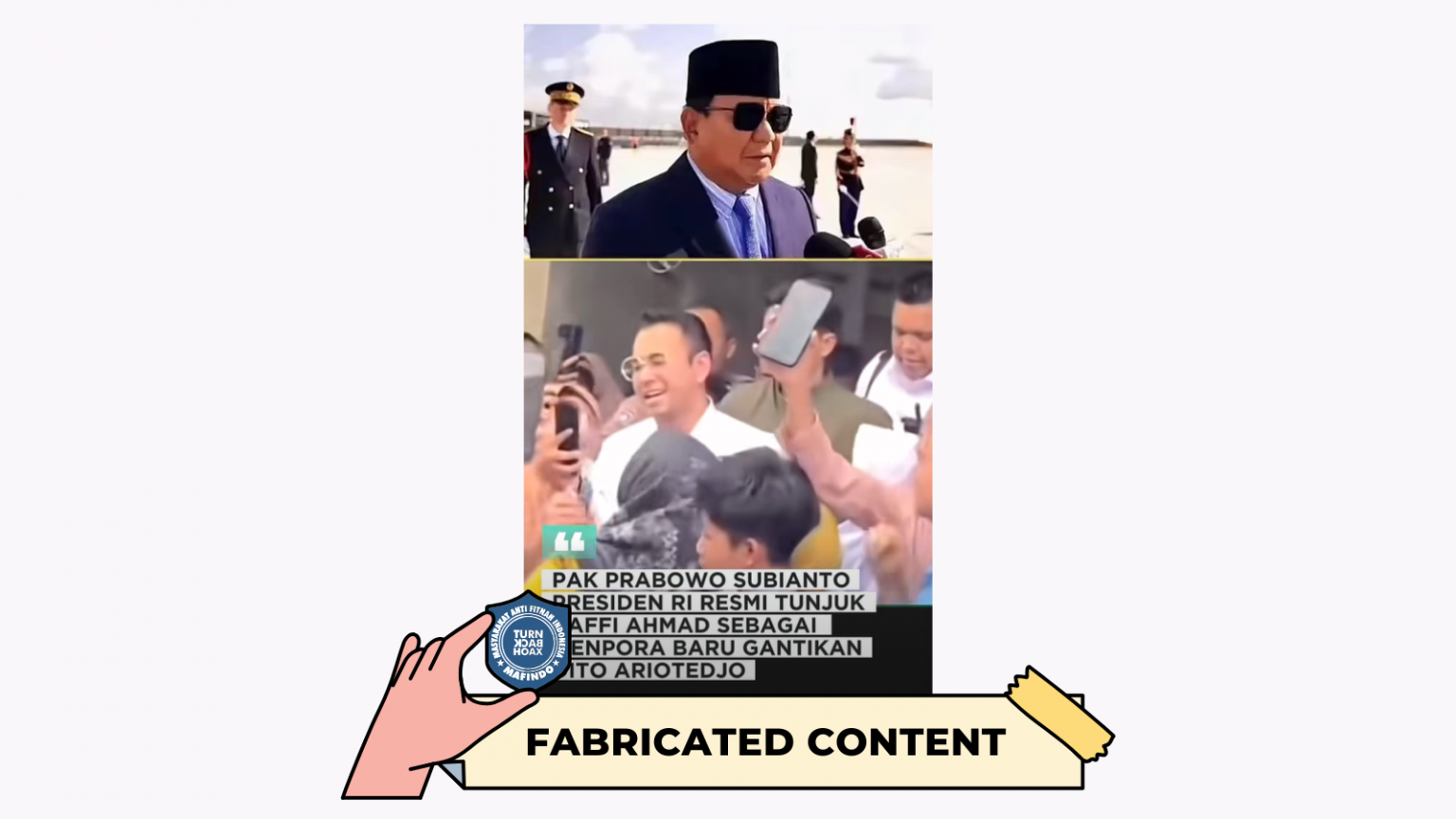 Unggahan video berisi narasi “Raffi Ahmad ditunjuk Prabowo menjadi Menpora, gantikan Dito Ariotedjo” merupakan konten palsu (fabricated content).