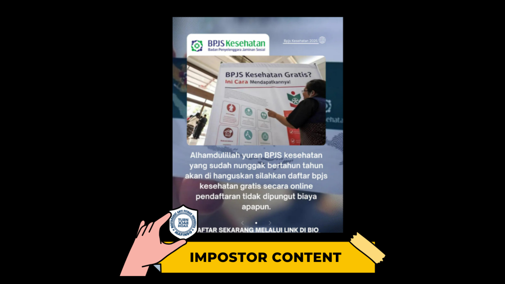 Unggahan dengan narasi “Tautan Pendaftaran Penghapusan Tunggakan BPJS kesehatan” merupakan konten tiruan (impostor content).