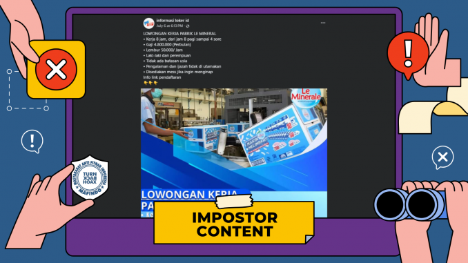 Unggahan berisi tautan pendaftaran “lowongan kerja Le Minerale” yang mengarah ke laman tak resmi itu merupakan konten tiruan (impostor content).