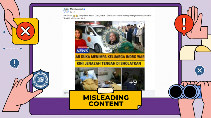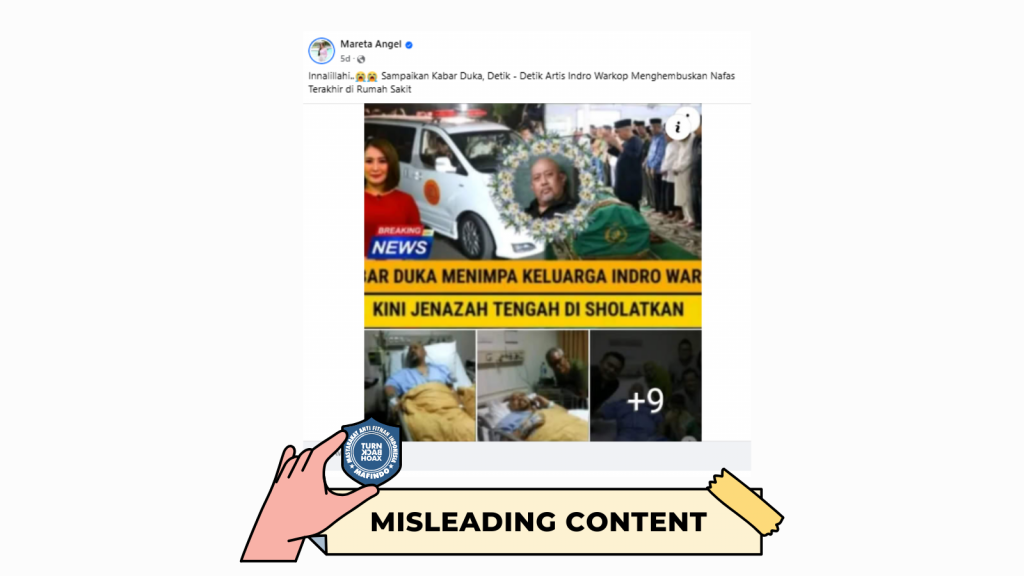 Pada Kamis (17/7/2025) akun Facebook “Mareta Angel” mengunggah foto [arsip] yang mengklaim pelawak Indro Warkop meninggal dunia di rumah sakit pada Kamis (17/7/2025). Foto tersebut disertai narasi :