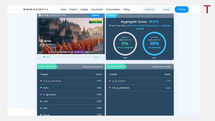 Beberapa potongan video diuji dengan alat Hive Moderation. Pada 20 detik pertama, alat ini menilai 99,8% konten dibuat oleh AI.