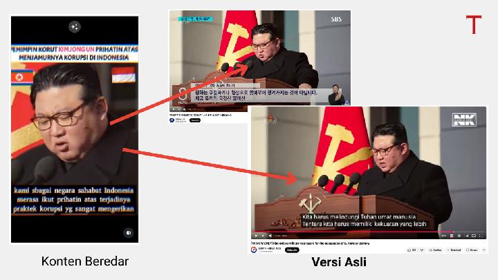 Tempo memverifikasi video itu dengan pencarian gambar terbalik Google dan membandingkannya dengan sumber kredibel. Hasilnya, video tersebut direkayasa dari video aslinya saat Kim Jong Un berpidato soal pentingnya persiapan militer pada 6 Mei 2025. Pengunggah menambahkan narasi seakan-akan terjemahan dari kalimat yang diucapkan Kim Jong Un.