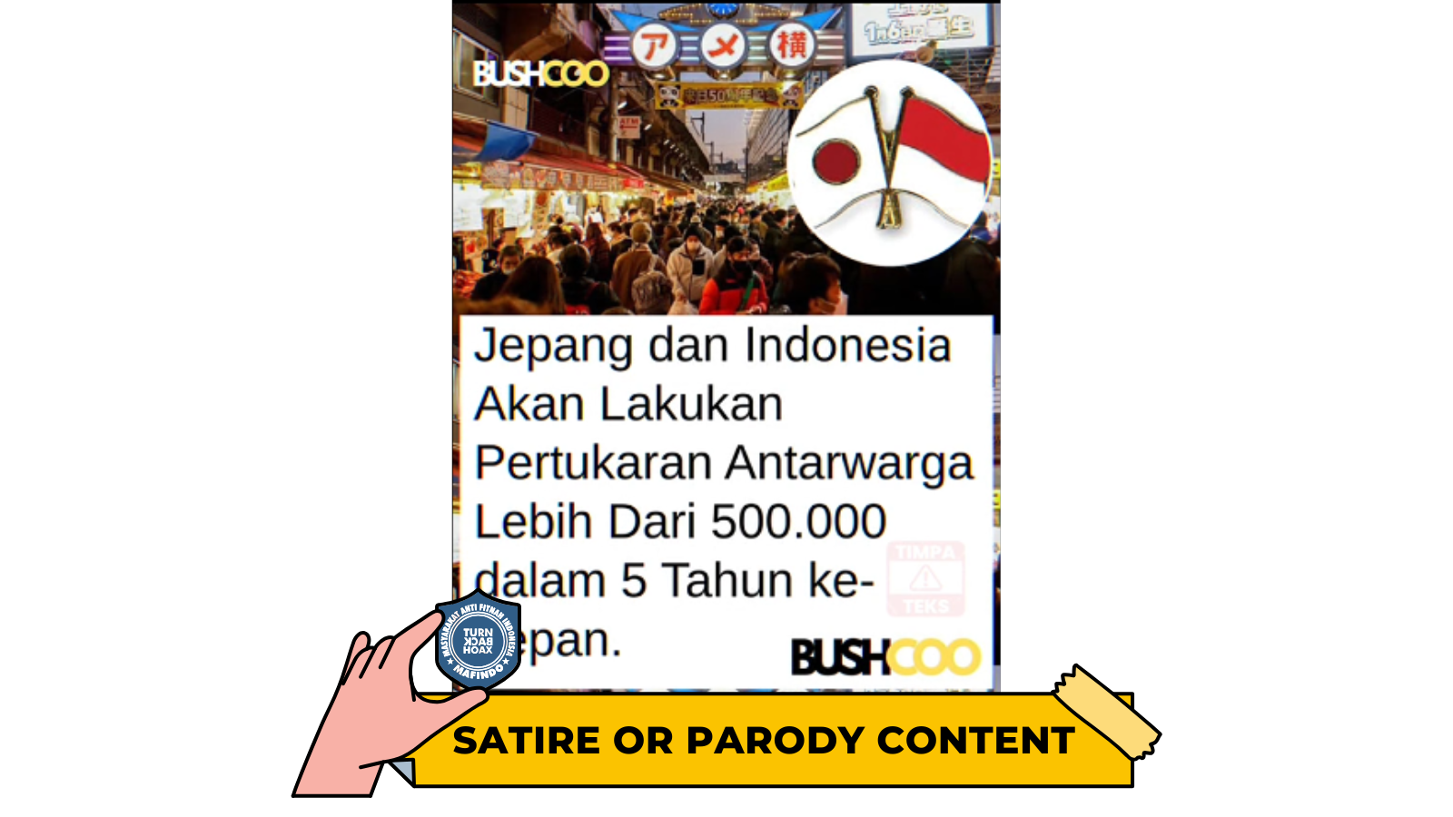 Unggahan berisi klaim “Jepang dan Indonesia akan lakukan pertukaran antarwarga lebih dari 500 ribu dalam 5 tahun ke depan” merupakan konten satire/parodi (satire/parody content).
