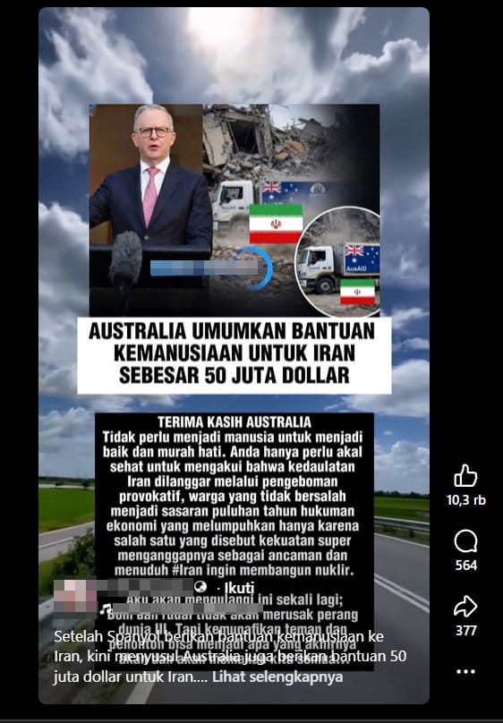 tirto.id - Sebuah unggahan video beredar di media sosial Facebook mengklaim Australia umumkan beri bantuan kemanusiaan Rp50 juta dolar untuk Iran.