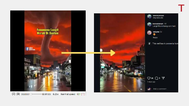 Tempo memverifikasi konten itu menggunakan pengamatan visual, membandingkannya dengan video asli, dan menggunakan deteksi akal imitasi (AI). Meskipun fenomena langit merah memang sempat terjadi di Kabupaten Pandeglang, namun tidak ada badai tornado. Video yang beredar itu dibuat dengan AI.