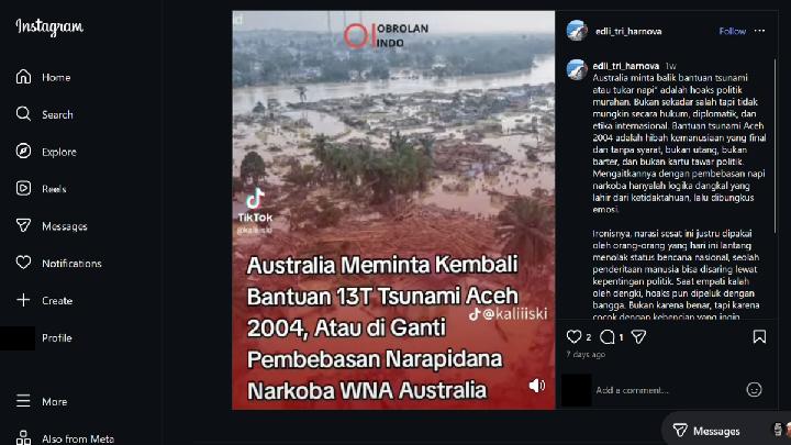 SEJUMLAH video dengan klaim bahwa Australia meminta Indonesia mengembalikan dana bantuan tsunami Aceh sebesar Rp 13 triliun, dibagikan di sejumlah media sosial termasuk di Instagram, akun TikTok 1 [arsip], dan akun TikTok 2 pada 19 Desember 2025.