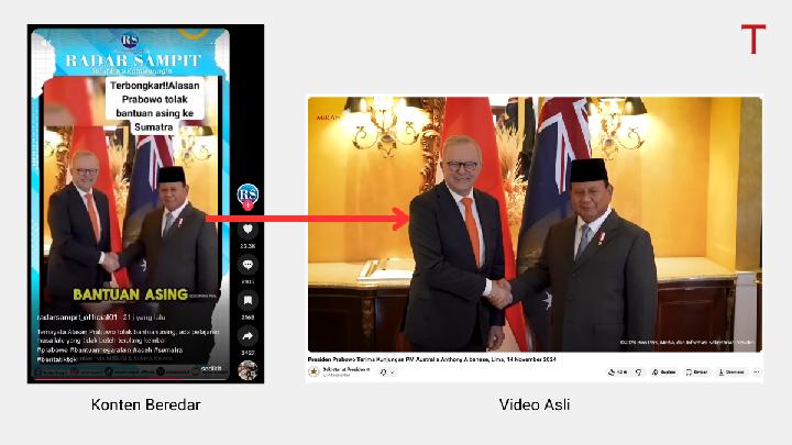 Konten-konten tersebut menyebar saat pemerintah pusat menolak menerima bantuan asing untuk bencana Sumatera. Narator dalam video menyebut bantuan asing penuh dengan kepentingan dan harus dibayar oleh Indonesia.