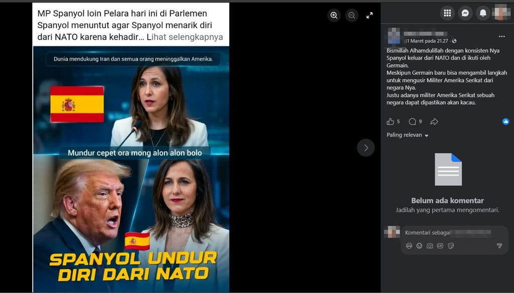 Kami justru diarahkan pada laman turnbackhoax.id, bahwa Unggahan foto berisi klaim “Spanyol keluar dari NATO usai AS serang Iran” merupakan konten palsu (fabricated content).