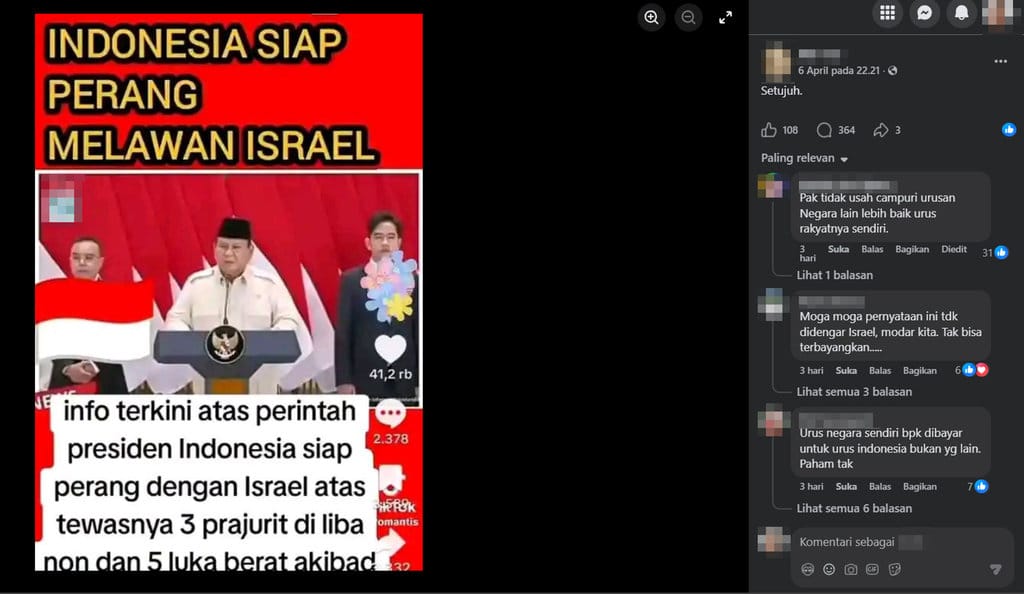 “Indonesia siap perang melawan Israel. Info terkini atas perintah presiden Indonesia siap perang dengan Israel atas tewasnya 3 prajurit di Libanon dan 5 luka berat akibad..” begitu keterangan tertulis dalam gambar.