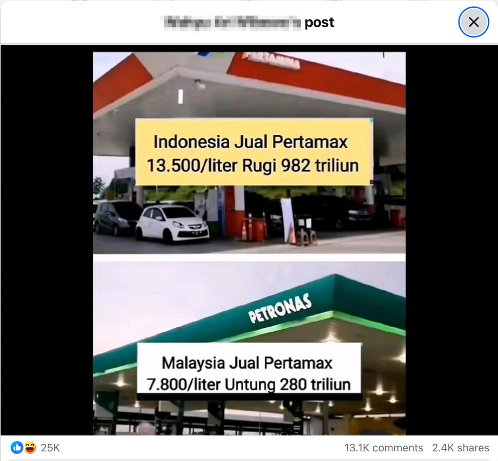 Akun Facebook bernama “Wahyu Ari Wibowo” (arsip) mengunggah klaim ini dalam bentuk gambar. Di dalamnya terdapat dua foto SPBU, masing-masing Pertamina dan Petronas, yang disertai tulisan: “Indonesia Jual Pertamax 13.500/liter Rugi 982 triliun” dan “Malaysia Jual Pertamax 7.800/liter Untung 280 triliun”.